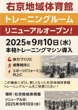 右京地域体育館 トレーニングルーム リニューアルオープンのお知らせ <2025年9月10日〜2026年3月31日>