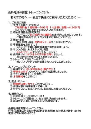 山科地域体育館 トレーニングジム 初めての方へ 山科地域体育館トレーニングジムをご利用いただきありがとうござい…
