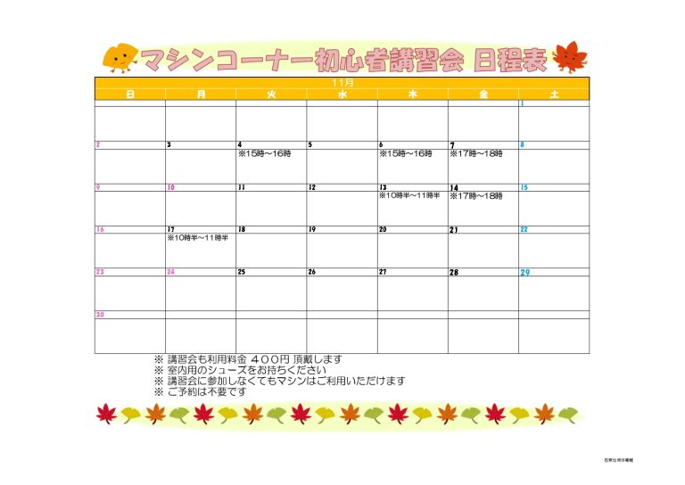 トレーニングマシンコーナーの11月初心者講習会実施のお知らせです。