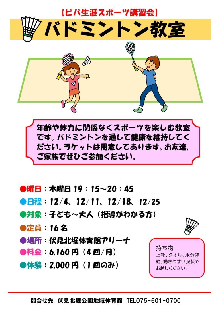 【北堀】生涯スポーツ講習会(バドミントン教室)開催のお知らせ <2025年12月4日〜25日>
