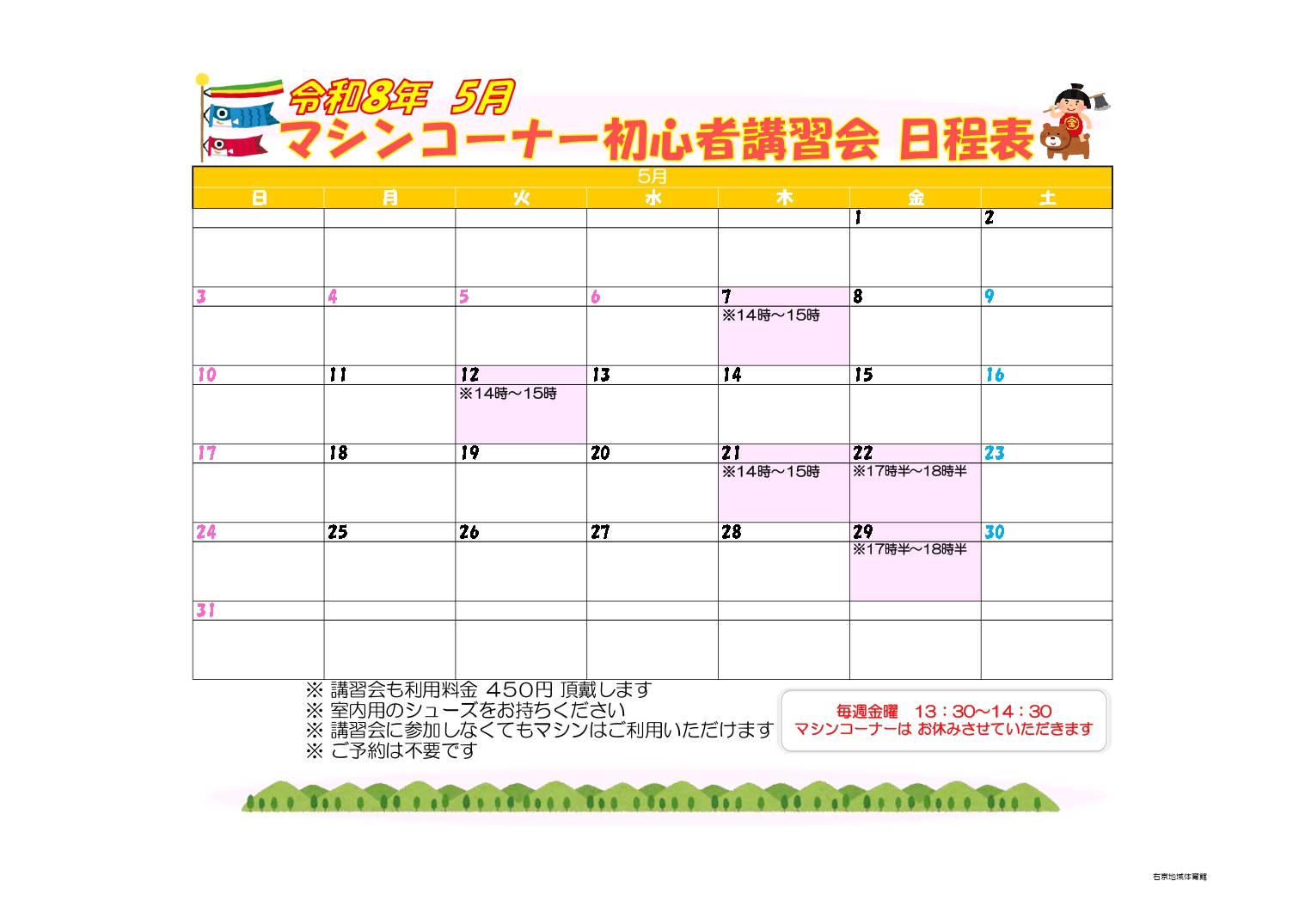 トレーニングマシンコーナーの5月初心者講習会実施のお知らせです。