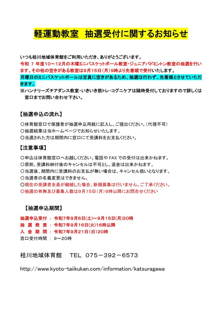 桂川【令和7年10~12月】木曜ミニバスケットボール・ジュニアバドミントン教室(19時~)抽選のお知らせ【8/31修正】