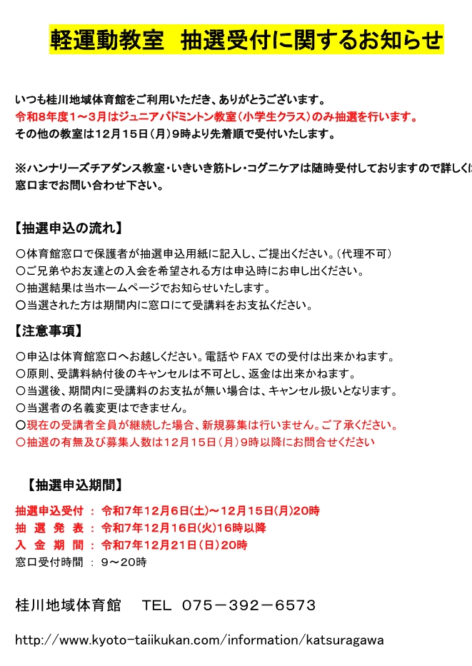 【桂川】令和8年1〜3月 軽運動教室抽選受付のついて