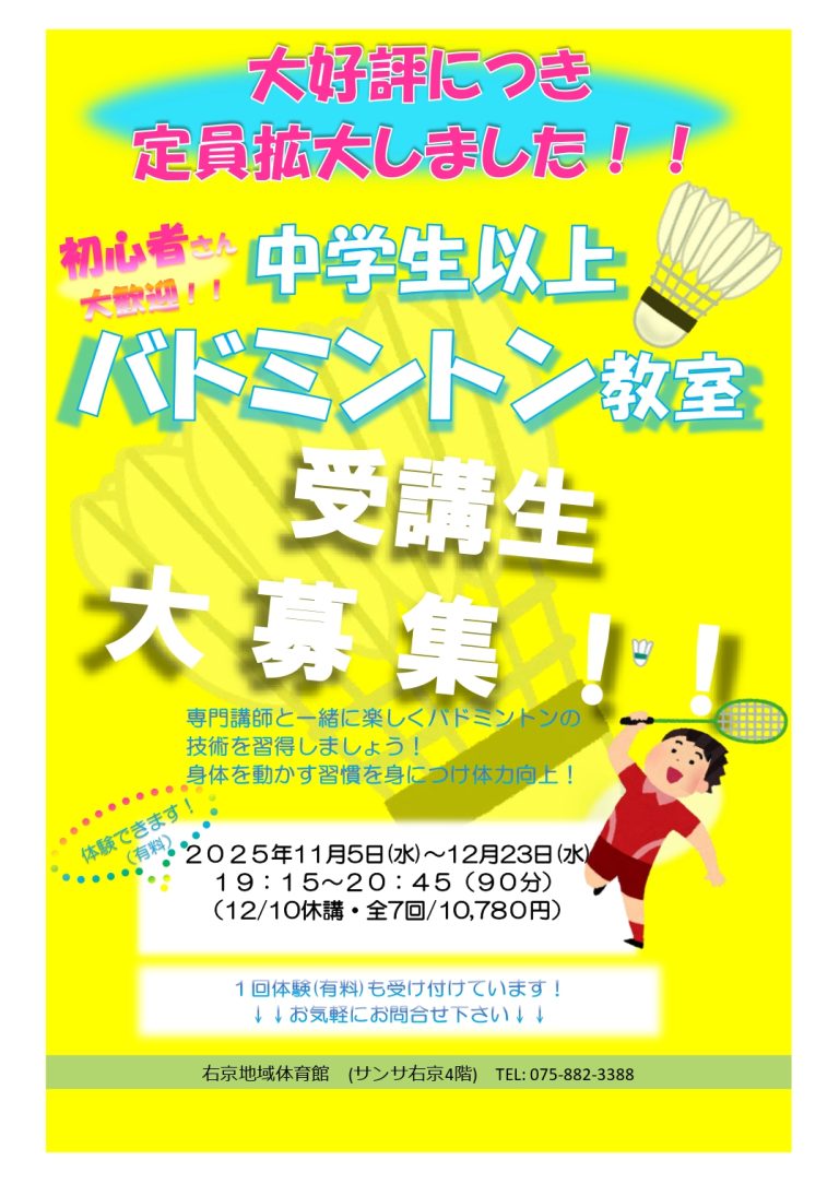 バドミントン教室ですが、大好評のため11月より定員を拡大いたします!