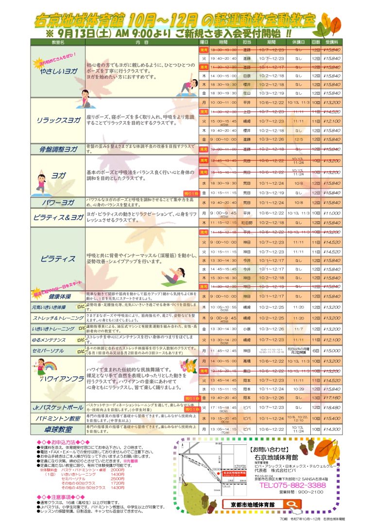 📞お問い合わせ先:右京地域体育館(TEL:075-882-3388)
