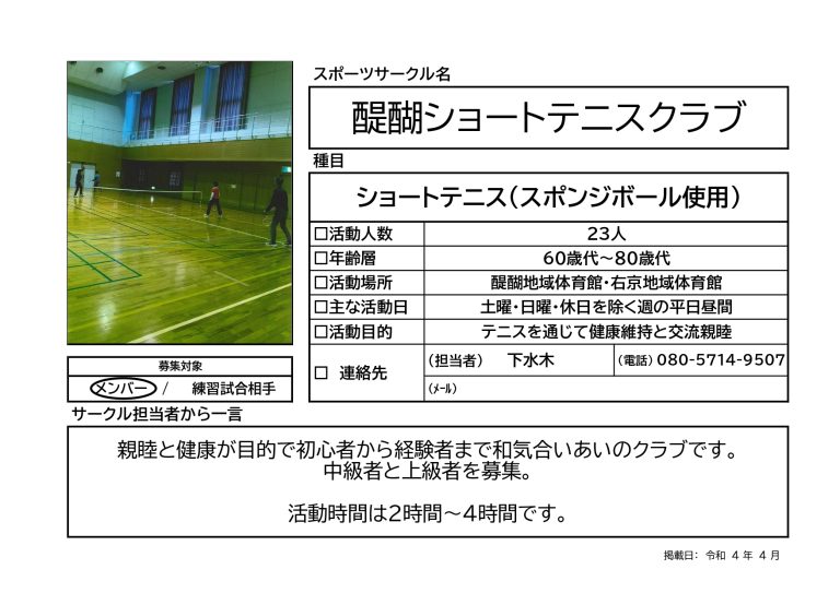 スポーツサークルの紹介です。 「醍醐ショートテニスクラブ」は親睦と健康づくりを目的としたクラブです。